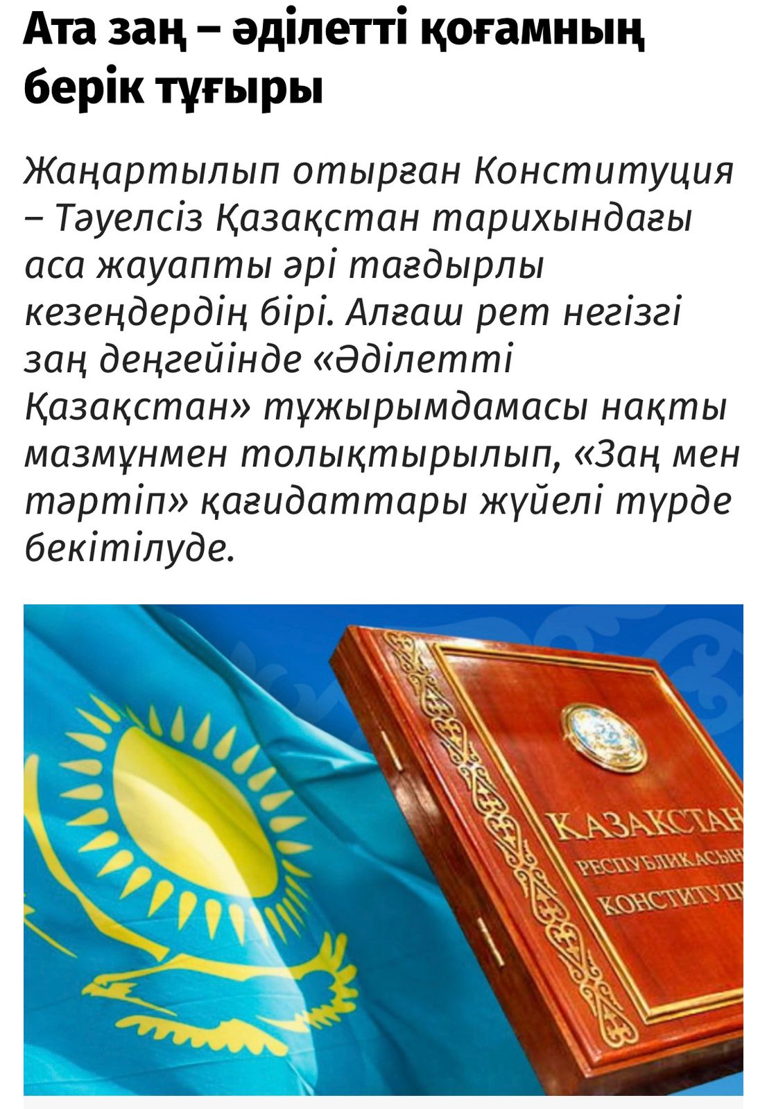 Ректор өз мақаласында Конституцияның мемлекеттің құқықтық, саяси және қоғамдық дамуының іргетасы екенін ерекше атап көрсетеді. Оның пікірінше, Ата Заң билік тармақтарының арасындағы тепе-теңдікті айқындап қана қоймай, азамат пен мемлекет арасындағы өзара жауапкершілікті нақтылайды. Сонымен қатар Конституция – қоғам құндылықтарын айқындайтын және елдің болашақ даму бағытын белгілейтін стратегиялық құжат.