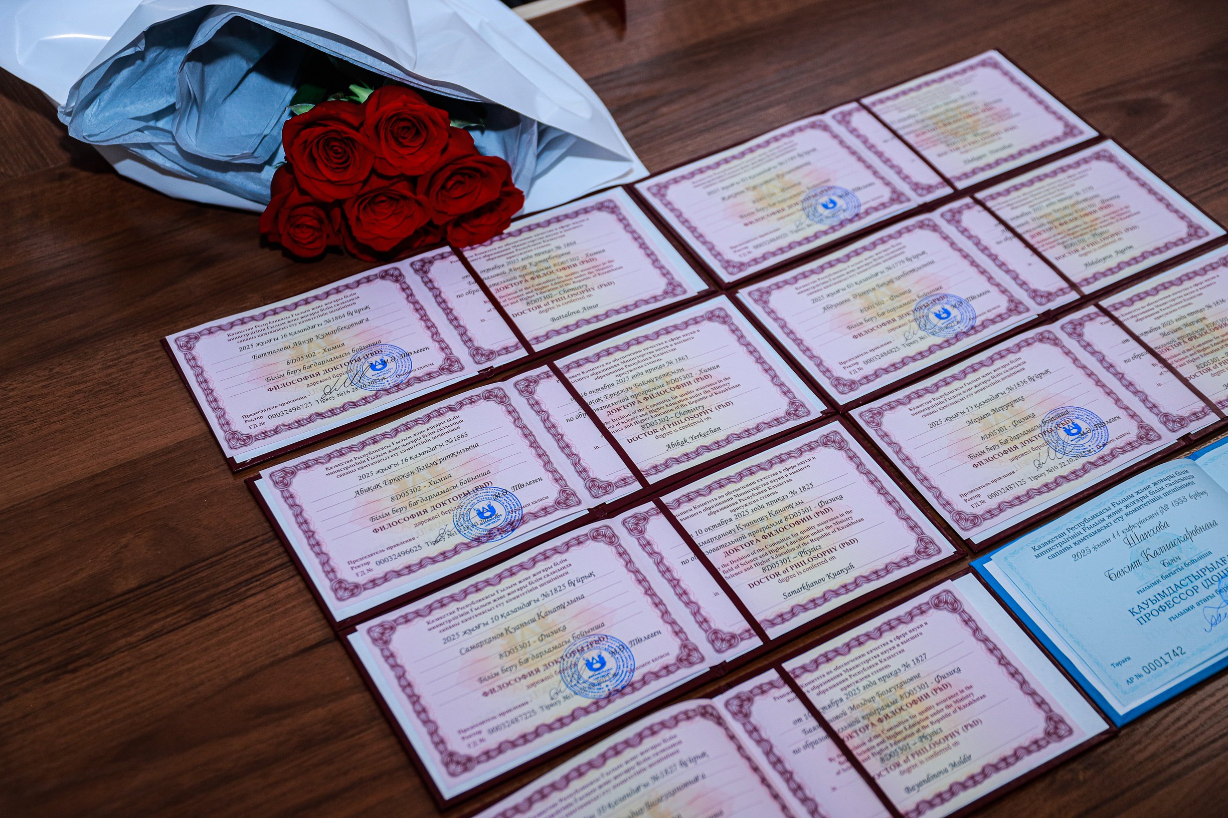 Бүгін университет үшін ерекше маңызды күн болды: жеті докторант диссертациясын сәтті қорғап, философия докторы (PhD) дәрежесін алды. Олардың арасында Куаныш Самарханов (Физика, 8D05301), Айнұр Батталова (Химия, 8D05302), Еркежан Абикак (Химия, 8D05302), Әйгерім Абдуллаева (Физика, 8D01502), Меруерт Маулет (Физика, 8D05301), Нұрсұлтан Жакупов (Физика, 8D01520),Мөлдір Баяндинова (Физика, 8D05301).